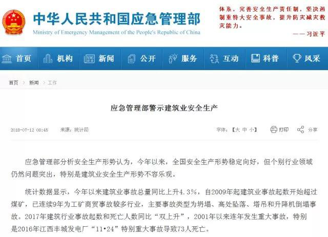 據應急管理部官網消息,統計數據顯示,今年以來建筑業事故總量同比上升4.3%,自2009年起建筑業事故起數開始超過煤礦,已連續9年為工礦商貿事故多行業,主要事故類型為坍塌、高處墜落、塔吊和升降機倒塌事故。2017年建筑行業事故起數和死亡人數同比“雙上升”,2001年以來連年發生重大事故,特別是2016年江西豐城發電廠“11?24”特別重大事故導致73人死亡。