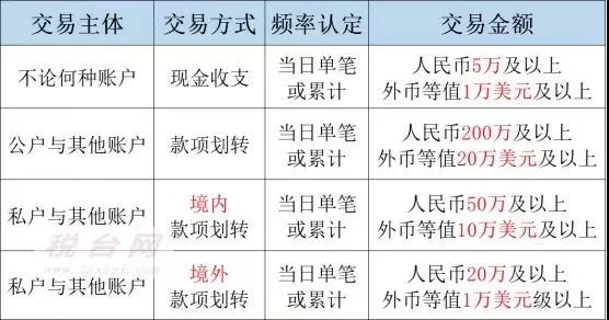 1、當日單筆或者累計交易人民幣5萬元以上(含5萬元)、外幣等值1萬美元以上(含1萬美元)的現金繳存、現金支取、現金結售匯、現鈔兌換、現金匯款、現金票據解付及其他形式的現金收支。