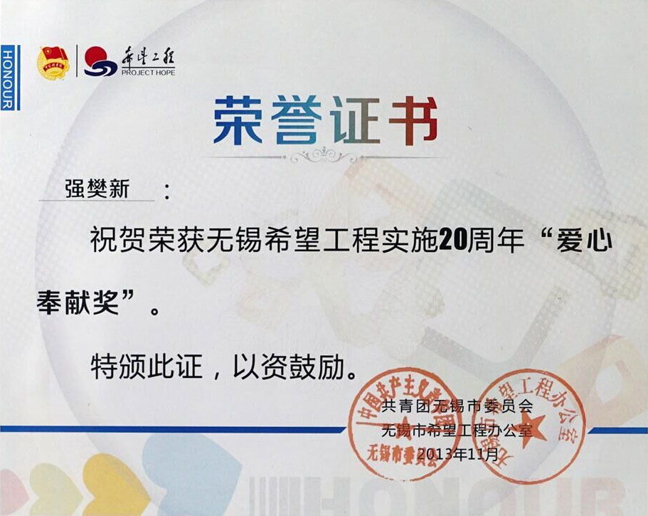 2013.11 無錫希望工程實施20周年愛心奉獻獎