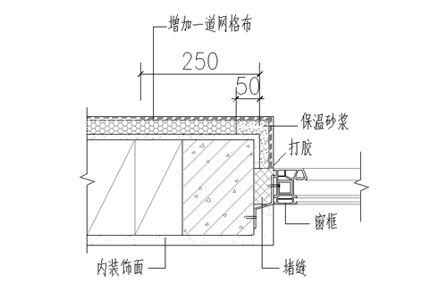 1.4外門窗洞口側面外保溫材料應采用保溫砂漿,厚度為20mm。當外保溫層厚度不超過30 mm,洞口保溫砂漿應該轉入立面50 mm(厚度同外保溫層厚度)。