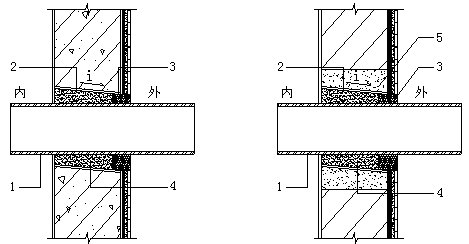1.10穿過外墻的管道應采用套管,套管應內高外低,坡度不應小于5%,套管周邊應作防水密封處理(圖1.10-1、1.10-2)。